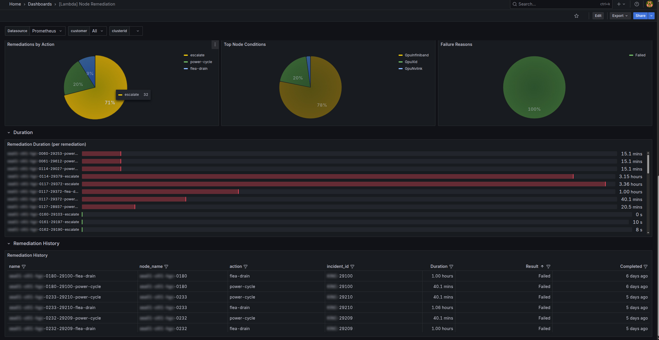 You can also view remediation activity by visiting the MK8s Grafana dashboards. To access the remediation dashboard: